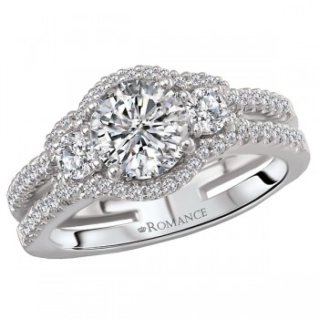 This High polished 18kt White Gold Ring Showcases a Plethora of Round Sparkling Faceted Diamonds running along the Split Shank and outlining the 3-Stone Halo Center. (D 3/8 carat total weight) This ring is a SEMI-MOUNT and it comes with NO CENTER STONE as shown but it will accommodate a 6.5mm round center stone.
