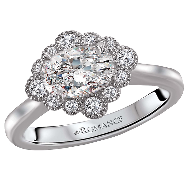This unique 18k white gold ring features sparkling round diamonds lined with milgrain that forms a halo around the center stone.(D 1/7 carat total weight) This ring is a SEMI-MOUNT and it comes with NO CENTER STONE as shown but it will accommodate a 7x5mm oval center stone.