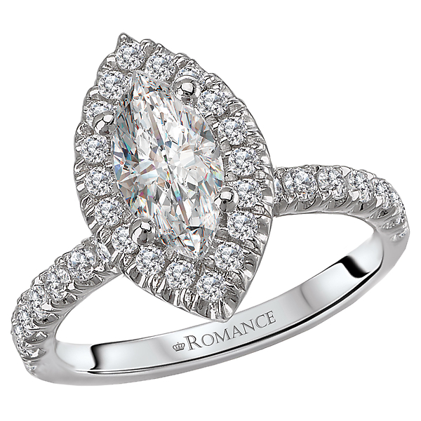 This marquise shaped halo ring is crafted in 18k white gold with round faceted diamonds and a peg head center. (D 5/8carat total weight) This peg head SEMI-MOUNT ring comes with NO CENTER STONE as shown but it will accommodate a 10x5mm marquise center.