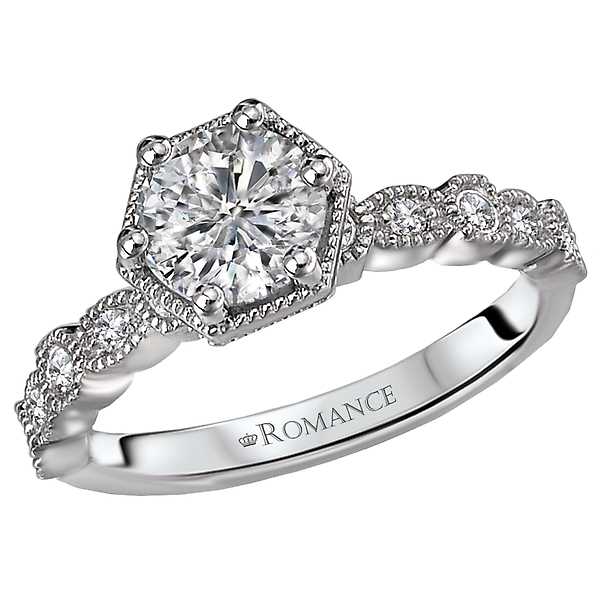 Engagement ring features a hexagon shaped halo created in high polished 18k white gold accented with milgrain detail that surrounds the center setting. (D 1/7 carat total weight) This ring is a SEMI-MOUNT and it comes with NO CENTER STONE as shown but it will accommodate a 6.5mm round center stone.