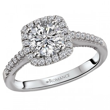 This designer inspired ring features an elegant cushion shaped halo created with round sparkling diamonds set in high polished 18kt white gold with a beaded design displayed on the shank. (D 1/3 carat total weight) This ring is a SEMI-MOUNT and it comes with NO CENTER STONE as shown but it will accommodate a 6.5mm round center stone.