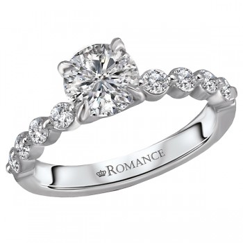 This bridal ring showcases sparkling diamonds surrounding the claw prong setting created in 18kt white gold that will accommodate a 6.5mm round center. (D. 3/8 carat total weight)