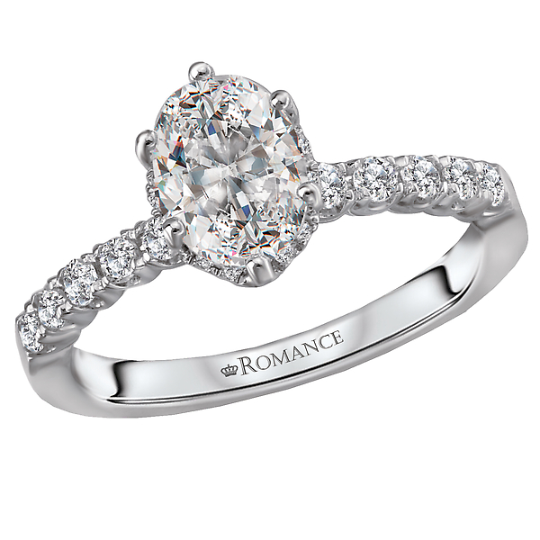 This oval shaped halo ring is crafted in 18kt white gold and features round faceted diamonds surrounding the center stone. (D 1/4 carat total weight) This SEMI-MOUNT ring comes with NO CENTER STONE as shown but it will accommodate a 7.5x5.5mm oval center stone.