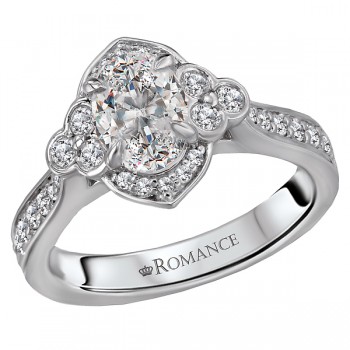 This bridal ring with its unique haloed center features round brilliant cut diamonds set in high polished 18k white gold surrounding the claw prong setting that will accommodate an oval 7.5x5.5mm stone of your choosing. (D 1/2 carat total weight)