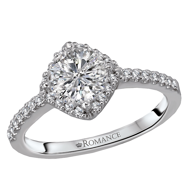 Haloed ring is lined with shimmering diamonds encompassing the center stone setting that will accommodate a round 6.5mm stone set in high polished 18k white gold. (D 1/5 carat total weight)