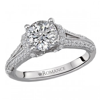 This stylish ring features a shank lined with faceted sparkling diamonds that surrounds the round center setting that will accommodate a 6.5mm round center set in high polished 18k white gold. (D 3/8 carat total weight)