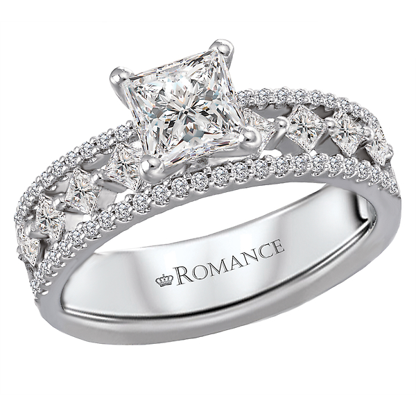 Dazzling engagement ring created in high polished 18k white gold showcases round and princess brilliant cut diamonds surrounding the center setting that will accommodate a 5.5mm princess diamond. (D 5/8 carat total weight)
