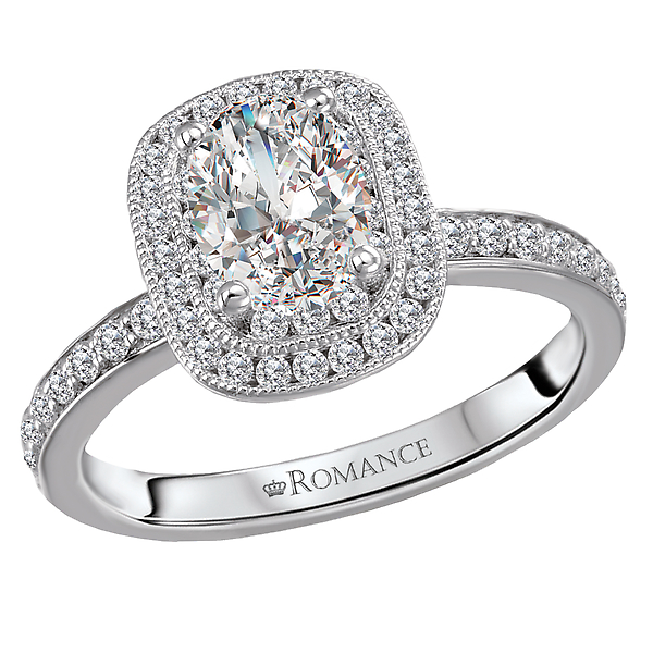 Crafted in high polished 18k white gold, this bridal ring showcases a stunning cushion shaped halo with round brilliant cut diamonds surrounding the center setting that will accommodate a 7.5x5.5mm oval diamond. (D 1/2 carat weight total)