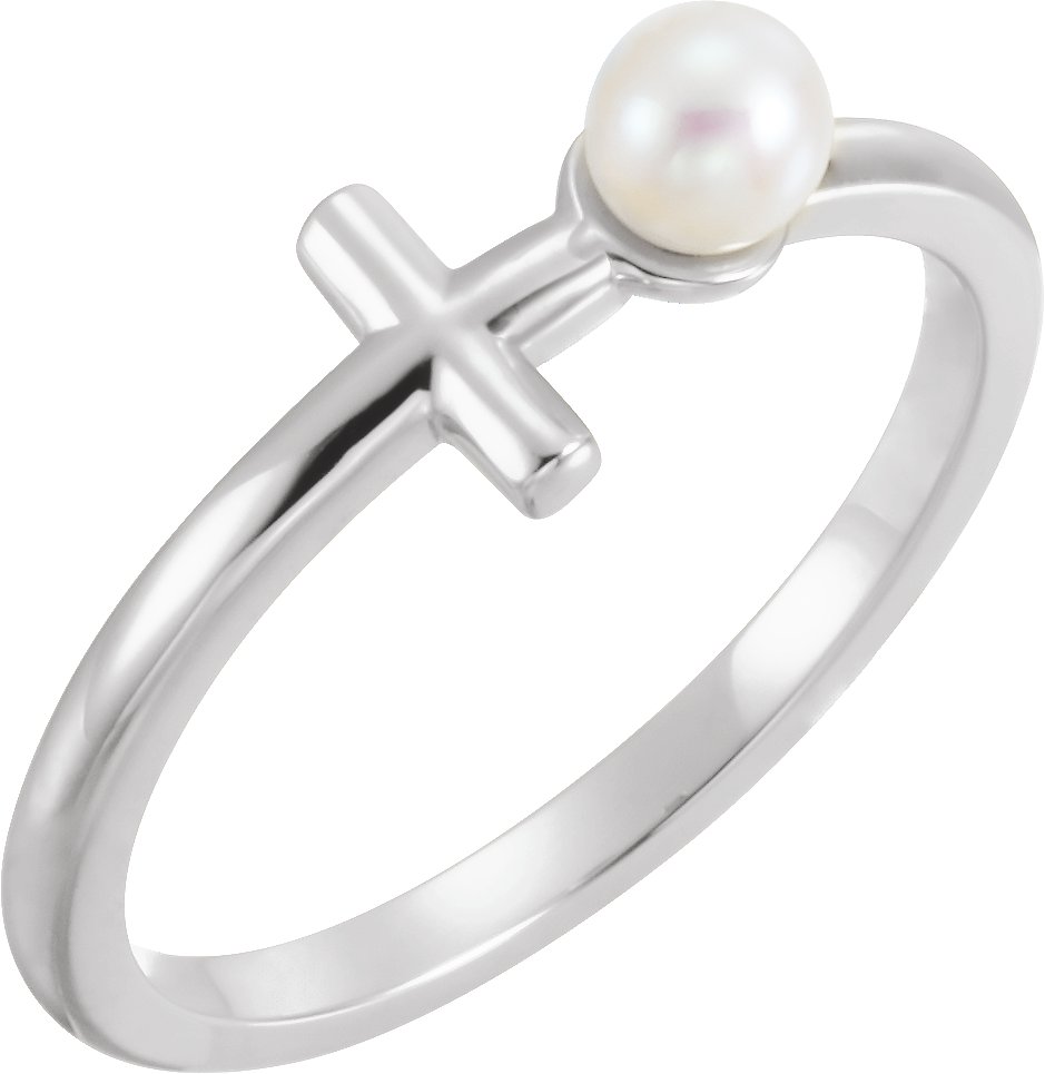 Sterling Silver Cultured White Freshwater Pearl Sideways Cross Ring