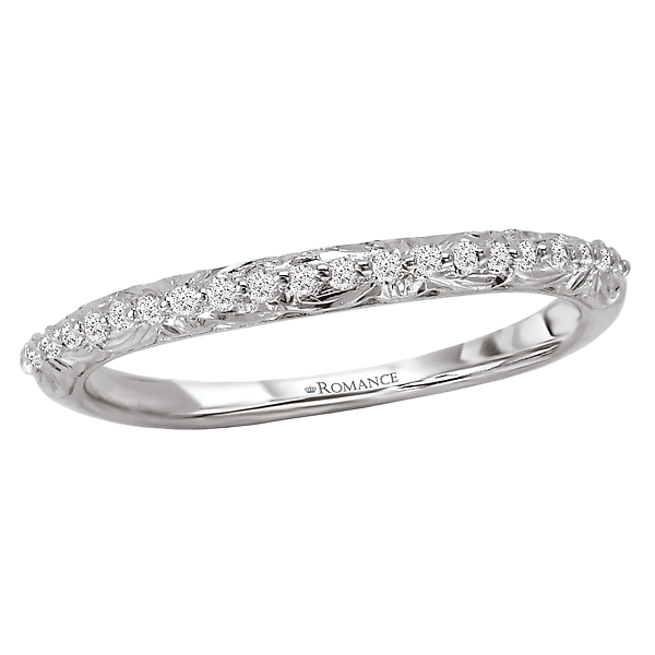 Curved Matching Wedding Band in 18kt White Gold with Engraved Detal. (D.1/8 carat total weight)