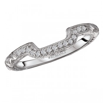 Curved Matching Wedding Band in 18kt White Gold with Etching and Milgrain Detail. (D .08 carat total weight)