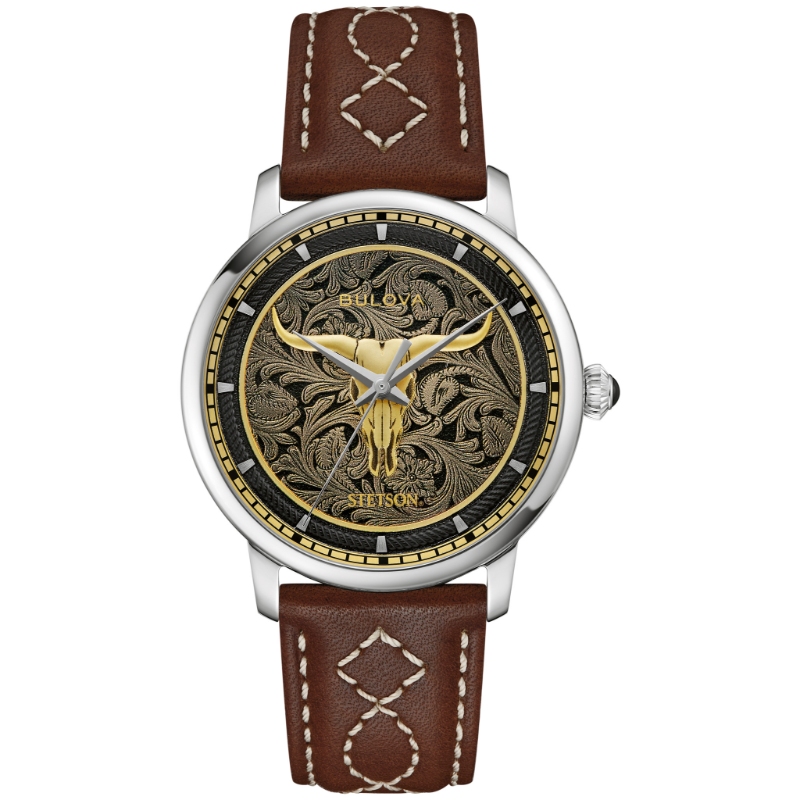 The Bulova x Stetson Longhorn watch brings two quintessential American heritage brands together to create an iconic timepiece that commemorates the founding of the John B. Stetson Company in 1865 through a collaboration steeped in heritage. On the dial, a gold-tone Texas Longhorn skull that symbolizes the enduring spirit of the West is set in relief against an ornate floral pattern inspired by the intricate decoration seen on traditional western wear. Echoing Stetson's legendary style and attention to detail, its silver-tone stainless steel case is elevated with a sapphire crystal and an onion crown with a black onyx cabochon. The automatic 21-jewel movement is visible through an open case back, which is printed with a classic Stetson hat and encircled with a laurel wreath pattern. Finished with a brown western-style leather strap, the 160th Anniversary Longhorn watch, is both a fitting tribute to and a continuation of the brands' dual commitment to quality and craftsmanship.