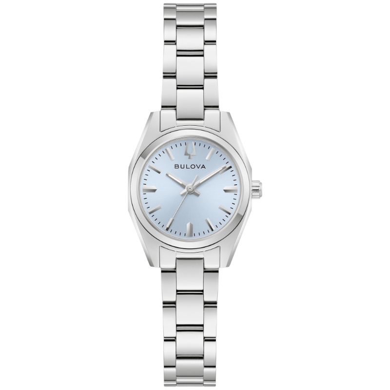 Defined by exceptional quality and sophisticated aesthetics, the Bulova ladies' Surveyor is the quintessential modern timepiece updated with a mini 23mm case. Sculpted edges and faceting distinguish the polished silver-tone stainless steel case, with polished and brushed finishing, a flat sapphire crystal, and a matching 3-link silver-tone stainless steel bracelet with a push-button deployant clasp and easy-release latched spring bars. The radiant light blue dial has a sunburst finish and silver-tone accents and hands with luminescent fill. For those with a discerning eye for refined luxury, this Bulova women's timepiece is the perfect everyday companion.