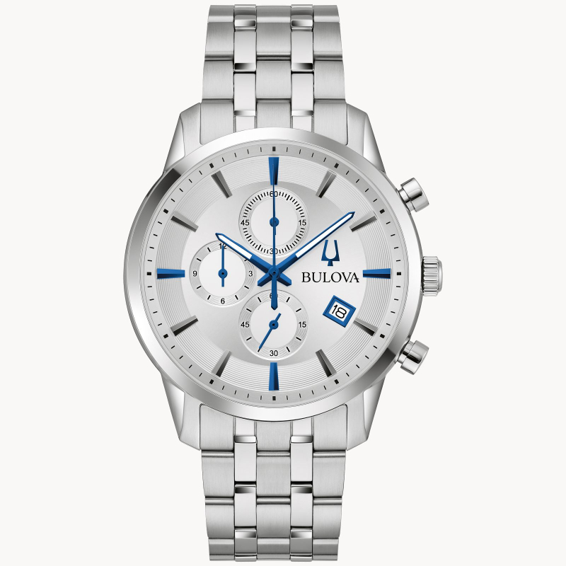 Timeless design and modern functionality define this new 6-hand Bulova men's chronograph from the Sutton Collection. A silver-tone stainless steel case with a blend of brushing and polishing offers a sophisticated aesthetic and features classically styled chronograph pushers and a domed mineral crystal. A sleek silver-tone dial features applied black and blue hour markers against a circular grooved track, luminescent blue hour and minute hands, and a date display. The chronograph can time events up to 12 hours to the nearest second. For a seamlessly elegant look, the watch is paired with a silver-tone stainless steel multilink bracelet with a deployant closure. Elevate your wardrobe with design that never goes out of style with this new Bulova men's chronograph timepiece from the Sutton Collection.