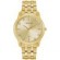 Gold-tone stainless steel case and bracelet with a champagne dial featuring eight diamonds set on the dial and gold-tone hands and markers, and a calendar window at the six o'clock position. Domed mineral crystal. Deployant buckle.