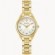 Gold-tone stainless steel case and bracelet with a silver white dial featuring three diamonds set on the dial and gold-tone hands and markers. Domed mineral crystal. Short fold over buckle closure.