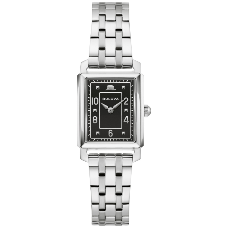 This enduring design from Bulova's Frank Sinatra collection is inspired by classic Bulova model from the legendary crooner's heyday. The watch features a 21mm silver-tone stainless steel case with a curved sapphire crystal with anti-reflective coating, a case back engraved with the Sinatra logo and "The Very Thought of You," and a matching 7-row bracelet with a push-button deployant clasp. The radiant black dial is appointed with a date display and silver-tone hands and applied markers, including Sinatra's signature fedora at 12 o'clock. As classic as Sinatra himself, this Bulova ladies' watch offered in a custom Frank Sinatra box is a timeless addition with style that will last a lifetime.