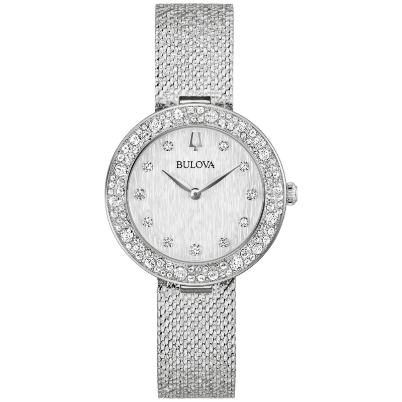 Step into the golden age of glitz and glamour with the luxuriously appointed women's Champagne Crystal timepiece. Meticulously set with 103 dazzling Austrian crystals, the silver-tone stainless steel case's bezel conjures the effervescence of champagne, while the glittering silver-tone fine mesh strap shimmers with sophistication and offers unrivaled comfort with its adjustable sliding buckle. The brilliant silver-tone dial is no less spectacular, with a refined texture, 11 crystal hour markers, and polished silver-tone hands creating a truly magnificent aesthetic. A timeless merging of style and grace, the Bulova ladies' Phantom timepiece elevates every ensemble and wardrobe.