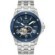 This new Bulova Marine Star men's watch combines classic nautical styling with a legacy that reaches back decades. The bold, angular silver-tone stainless steel case features brushed finishing with polished accents, a deep blue bezel, a flat mineral crystal, and a screw-down crown. The striking blue dial combines sunray texture along the hour track and a central dial with a radiant sunburst finish, complete with hands with luminescent treatment, polished indices, and a running seconds sub-dial with orange accents. Visible through both the dial aperture and an exhibition case back, the open heartbeat automatic movement features 21 jewels and a 42-hour power reserve. The 45mm watch is complemented with a matching silver-tone stainless steel bracelet with a push-button deployant clasp. The watch is water resistant to 200 meters, living up to its name as a timepiece that can go wherever you do without missing a beat.
