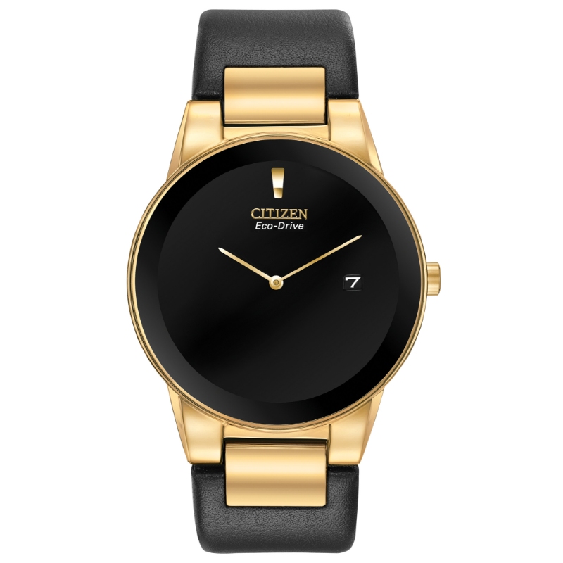 Axiom's refined yet sleek design offers a day-to-night fashion options for the avid trendsetter. A watch with CITIZEN's Eco-Drive technology, not just a solar watch, but powered by any light, featured in a men's gold-tone stainless steel case, black leather strap with black dial and the intriguing feature of edge-to-edge glass. Caliber number J165.