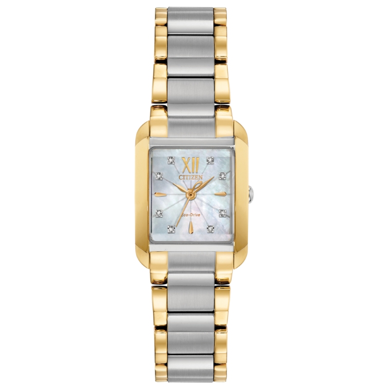 The CITIZEN L Collection represents the epitome of a ladies timepiece, showcasing all the sophistication, style and power that appeal to today's woman. The simplicity of the Citizen L case is partnered with an elegant light white Mother-of-Pearl dial with beveled sapphire crystal. Featured here in two-tone stainless steel. Featuring our Eco-Drive technology - powered by light, any light. Never needs a battery. Caliber number B035.
