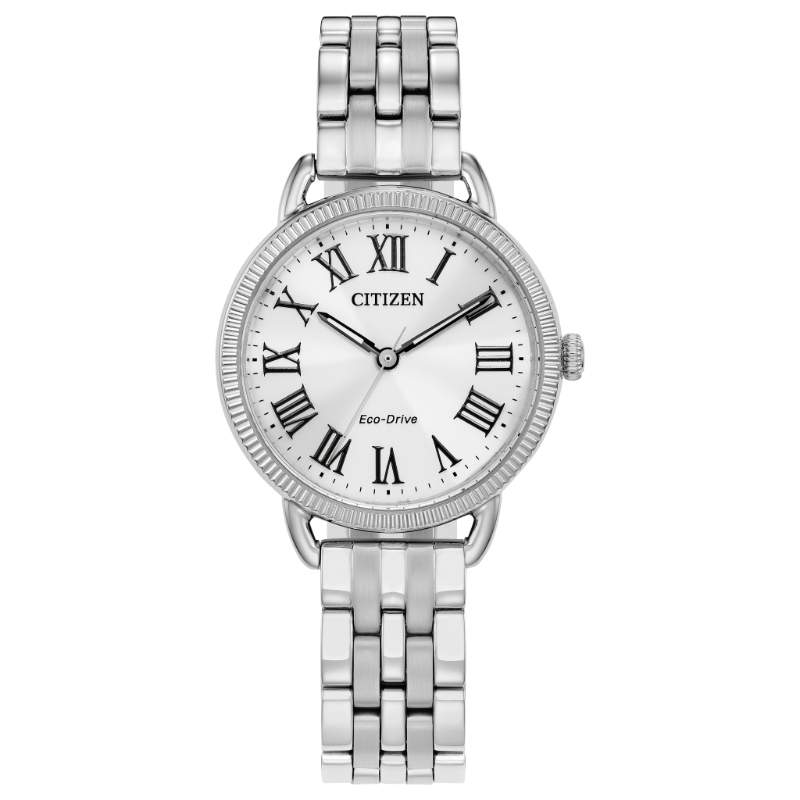 A modern twist on a classic design. Featuring an elegant silver-tone case with a textured, coin edge bezel and silver-tone 3-hand dial with bold Roman numerals, this sleek watch stands out from the crowd while remaining understated. A silver-tone stainless steel fold-over clasp fastens this watch for a minimalist look. Sustainably powered by light with Eco-Drive technology, this watch never needs a battery and offers a refined look and upscale feel.