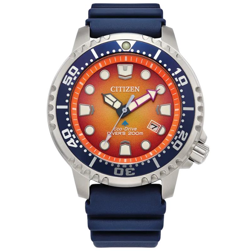 Explore the deepest depths with the latest Promaster Dive in a stylish�new color combination. This must-have diving watch vibrantly features a silver-tone stainless steel case, an orange�3-hand dial with a date function, and luminous hands and markers. The durable, blue polyurethane strap with buckle closure completes the look for a comfortable fit. Featuring our sustainable Eco-Drive technology powered by any light that never needs a battery, you'll wear this high-performance timepiece in high style from adventures on land to the deep blue sea. ISO compliant and water resistant to 200 meters. Caliber E168.