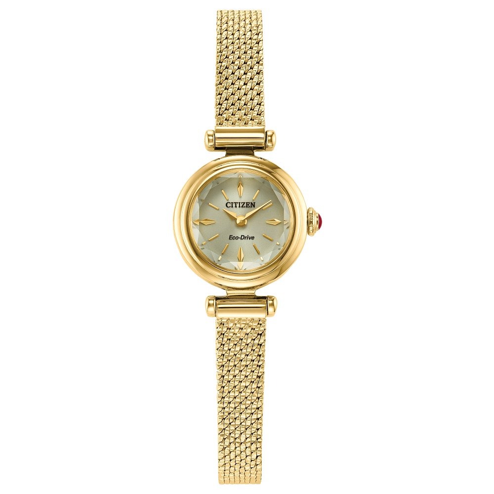 Measuring 18.4mm, the round yellow gold-tone stainless steel case is paired seamlessly with an ultra-slim bracelet for a graceful, luminous presence on the wrist. Distinct lugs and a faceted mineral crystal add sculptural detail, while a crown accented with a subtle red cabochon adds a vibrant touch of contrast. A matching gold-tone sunray dial completes the look, accented with applied indices and sword-style hands. Water resistant up to 30 meters. Caliber G626.