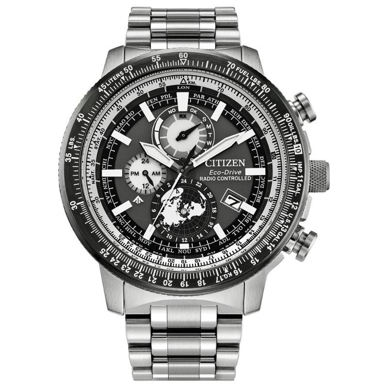 Touch the edge of the sky with the new Promaster Air Geo Trekker, featuring global Radio Control timekeeping for exceptional accuracy. A striking 46mm stainless steel case in silver-tone centers the design, with the professional-grade pilot's watch mission-ready on the wrist - fully equipped with a bold set of chronograph pushers, 5-link stainless steel bracelet, and an outer slide rule bezel.