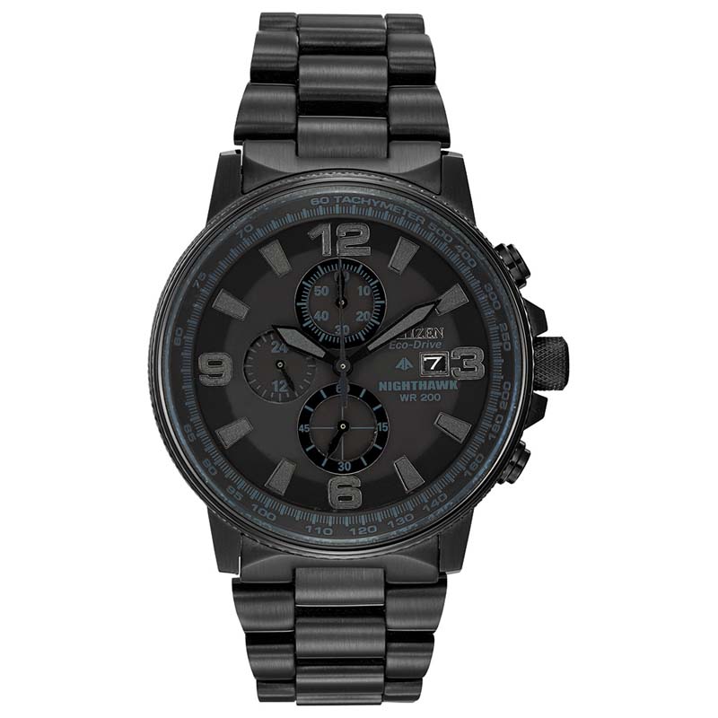 Master monochromatic style with the "Blackout" Nighthawk. The sporty design will strike up a conversation with its distinctive look in all black ion-plated stainless steel and with advanced features, including the 1/5 second chronograph that measures up to 60 minutes, 12/24 hour time and a tachymeter that measures speed based on time traveled over a distance. It also has screw-back case, a bracelet with safety foldover clasp with push button, and water resistant to 200 meters. Featuring our proprietary Eco-Drive technology that's sustainably powered by any light and never needs a battery, this versatile watch stands out is essential for every man's weekday to weekend wardrobe. Caliber number B612.