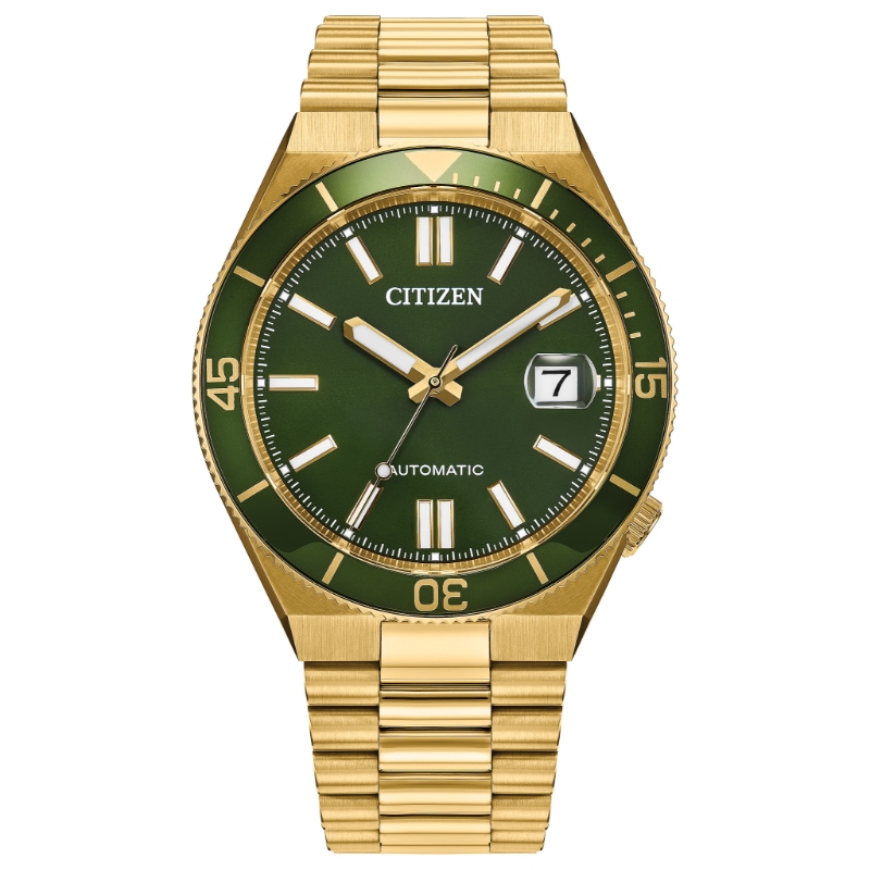 Blending the bold style of the TSUYOSA line with enhanced water-ready performance, the TSUYOSA Shore delivers our sport-luxury design with a striking gold-tone presence. Measuring 40mm across, the yellow gold-tone stainless steel case elevates the look, complemented by a rich green sunray dial and a matching 120-click unidirectional bezel for a vivid, sporty edge. A wide handset and luminous accents ensure quick legibility, while a sapphire crystal with a magnified 3 o'clock date window provides everyday practicality. Powered by our automatic Caliber 8210, the TSUYOSA Shore delivers reliable mechanical precision, complete with a hacking seconds mechanism for accurate time setting. A seamlessly integrated gold-tone stainless steel bracelet completes the versatile design, bringing refined durability to a watch that's as ready for the shore as it is for the city.