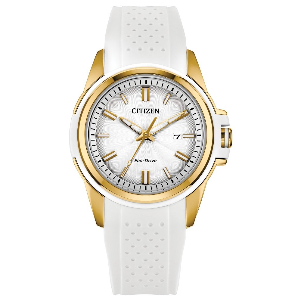 Sporty and playful, the Veya combines everyday versatility with refined touches. Sustainably powered by any light with our proprietary Eco-Drive technology, this timepiece never needs a battery. The 33.4mm yellow gold-tone stainless steel case is action-ready in style, featuring white resin accents paired with a matching silicone strap for a fresh, modern look. A sunray silver dial with gold-tone accents is enhanced by luminous hands, applied markers, and a curved outer minute ring for quick legibility, while a 3 o'clock date display provides everyday utility. Water resistant up to 100 meters. Caliber J710.